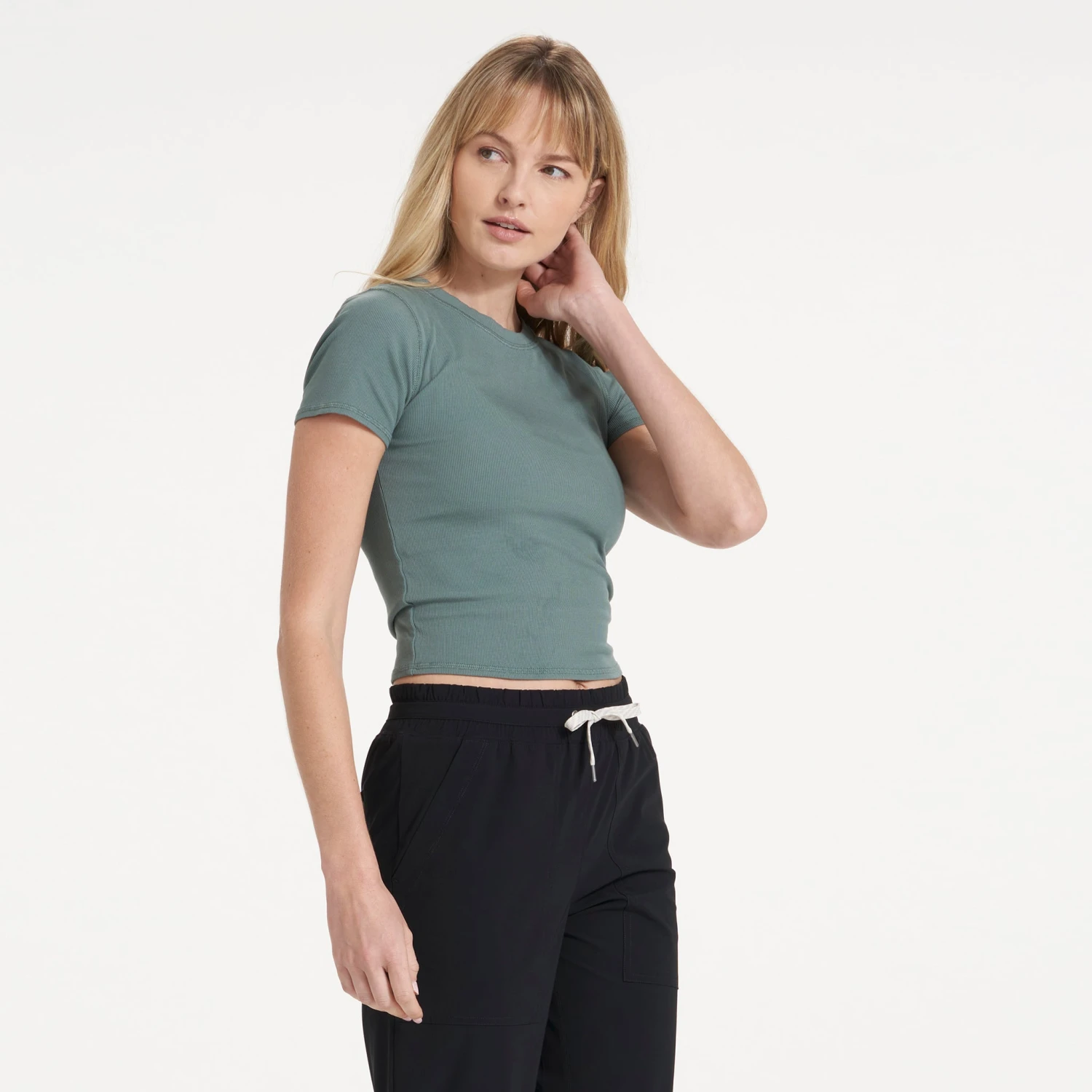 Crafted in a new premium Modal fabric, the sustainable stretch rib knit and effortless high-hip fit of the Mudra Fitted Tee has stretch, and timeless comfort. Great for layering in and out of the studio.