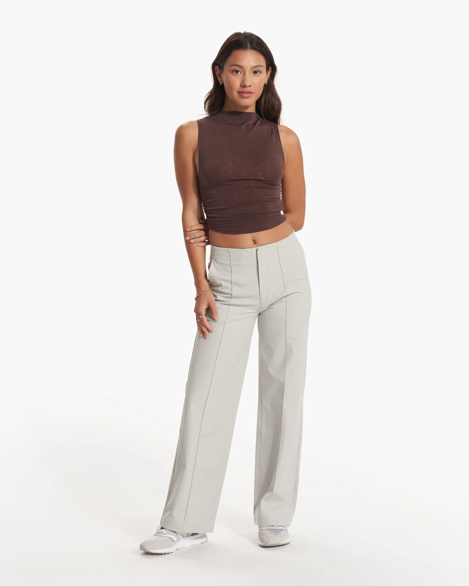This is the modern tank. Pairing ruched sides with a high mock neck, it’s made with our buttery-soft performance stretch jersey with Better Cotton. Both flattering and functional.
